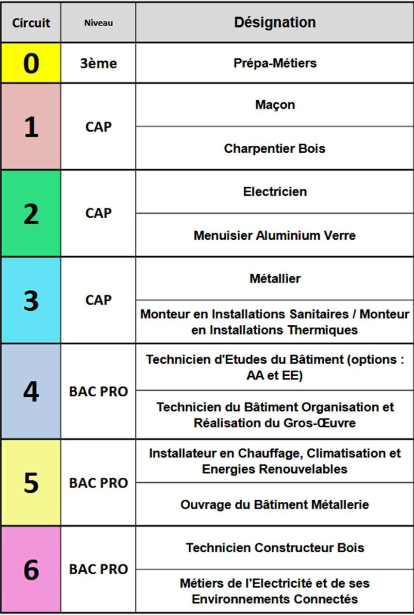 | Lycée Fernand Léger (Bédarieux) | - CAP BOIS option charpentier - CAP SDG (signalétique et décors graphiques) - CAP MIT (monteur en installations thermiques) - CAP IMTB (interventions en maintenance technique du bâtiment) - CAP CRCTP (constructeur de réseaux de canalisations des travaux publics) - 2nde PRO MTNE (métiers des transitions numériques et énergétiques) options MELEC et ICCER - 2nde PRO MEMNBAT (métiers des études et de la modélisation numérique du bâtiment) TEB option études et économies - 2nde PRO MCDBTP (métiers de la construction durable, du bâtiment et des travaux publics) options TP et AFIB - BMA arts graphiques option B (décor peint) |