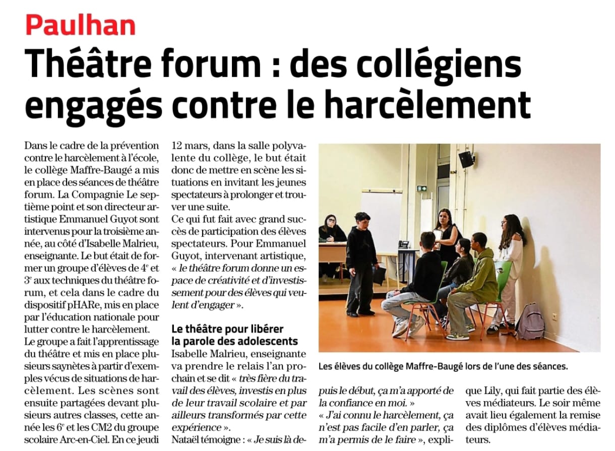 La fin de l'aventure "théâtre forum" a sonné le jeudi 19 mars 2026 après plusieurs semaines de préparation et 2 jours de représentations devant nos élèves de 6ème et 2 classes de CM2. Une représentation spéciale a été proposée aux nouveaux élèves médiateurs 2026 ainsi qu'aux parents et représentants de la communauté de commune, offrant l'occasion à